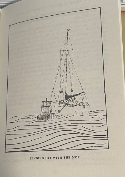 The fog lifts, but then it starts to get dark. Susan is now frantic with worry, particularly when they’re nearly mown down by a steamer. Her seasickness has calmed down, but when they try to turn around; instead of the wind coming from behind them and blowing them along easily, they have to tack into the wind. Turning around to sail into the wind, Susan gets even sicker, she knows she won’t cope if they try to turn around. Miserably Susan agrees for them to carry on, but John also now needs to reef the sails (make them smaller, so they’re easier to manage). Jim showed them how it was done, but he’s not done it before. Susan starts to steer, John puts a lifeline around his waist and nearly gets swept overboard.